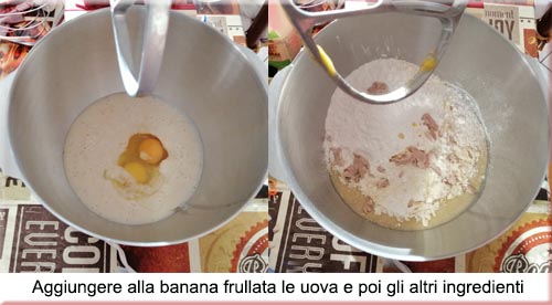 1.Frullare le banane con lo zucchero e l’olio di girasole. Versare nel contenitore della planetaria con gancio a foglia. Aggiungere due uova e far girare a velocità moderata.