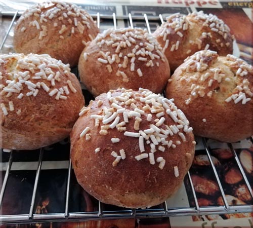 5.Scaldare il forno in modalità statica a 180 gradi. Prima di infornare pennellare nuovamente la superficie delle palline e mettere la granella di zucchero senza però schiacciarle. Infornare e cuocere in posizione centrale senza aprire il forno per circa mezz’ora. I panini saranno cotti quando avranno un bel colore dorato all’esterno.