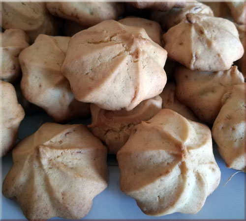 3.Riempire con l’impasto una sac à poche e formare direttamente sulla teglia foderata di carta forno dei mucchietti. Infornare a 180 gradi per 20- 25 minuti.