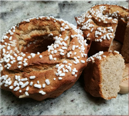 3.Ungere due teglie piccole per ciambella o una grande a piacere (24 cm) , riempire con l’impasto e dopo aver livellato la superficie con un cucchiaio, aggiungere un po’ di granella di zucchero in superficie.