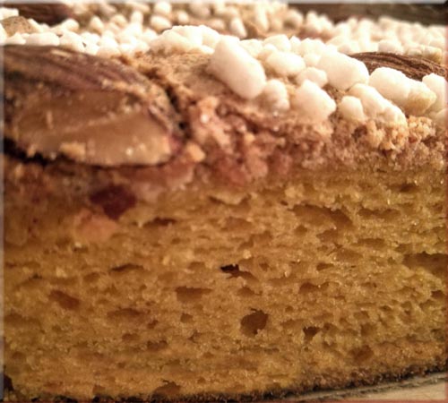 5.Quando sarà quasi lievitata ( circa 10 minuti prima) , preparare la glassa montando i due albumi a neve con lo zucchero a velo. Intento che montano gli albumi tritate 60 gr di mandorle intere con l’amido di mais e la farina di riso. Servendosi di una spatola unire la polvere agli albumi montati, facendo con delicatezza per non smontare troppo gli albumi.