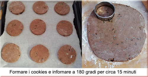 4.Stendere l’impasto di altezza di circa un centimetro , scegliere la dimensione del cerchio e tagliare con un coppapasta, posizionando i cookies su una teglia foderata di carta forno.