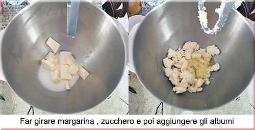 1.Nel contenitore della planetaria con gancio a foglia mettere la margarina con lo zucchero e far girare fono a quando comincerà ad ammorbidirsi.