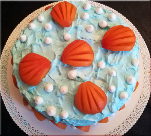 6. Con la panna montata rimasta coprire la torta esternamente per eliminare le imperfezioni e darle un aspetto liscio. Montare ancora 250 ml di panna , in una sac à poche mettere qualche goccia di colorante blu gel e dopo averla riempita anche di panna montata, fare dei mucchietti a piacere sulla superficie della torta. Lisciare con una spatola, anche perché in questo modo il colore si miscelerà ulteriormente donando un effetto sfumato tipo onde del mare. La superficie sopra della torta può essere lasciata abbastanza ondulata, mentre i bordi è meglio siano lisci così da poter attaccare meglio le decorazioni.