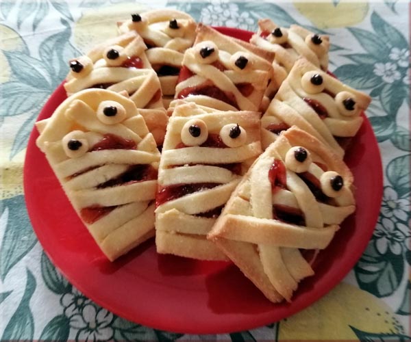 Biscotti senza glutine a tema Halloween, realizzati con farina di riso e mais fioretto, farciti con confettura di fragole. Le decorazioni sono realizzate con pasta frolla e cioccolato, creati apposta per chi non vuole utilizzare la pasta di zucchero o la ghiaccia reale.Guarda qui come realizzarle