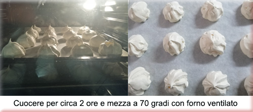 6.Foderare due teglie con carta forno , riempire una sac à poche con punta a stella e formare dei mucchietti poco più grandi di una noce. Infornare le due teglie in posizione centrale del forno e non aprire prima che siano trascorse almeno due ore e mezza. Dopo questo tempo spegnere il forno e lasciare raffreddare le meringhe nel forno.
