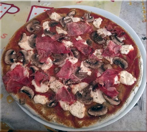 4.Preriscaldare il forno a 200 gradi e intanto farcire la pizza con passata di pomodoro , stracchino di soia , prosciutto cotto e funghi champignon freschi tagliati a fette sottili. Si può ammorbidire e rendere più cremoso il formaggino di soia miscelando 3 cucchiai di latte di riso o soia e mescolarlo bene finché sarà cremoso. Così facendo sarà anche più semplice da distribuire sulla pizza. Finire con origano , sale e olio. Attendere 10 minuti prima di infornare.