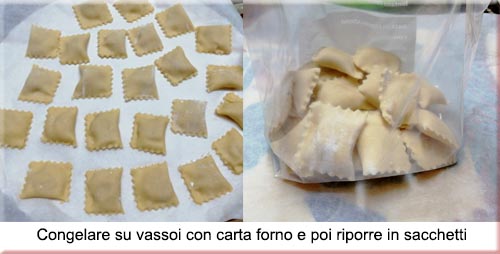 7.Disporre i tortelli su vassoi foderati di carta forno e riporre in congelatore. Lasciare congelare per circa 20 minuti poi metterli in sacchetti per alimenti e conservarli in congelatore.