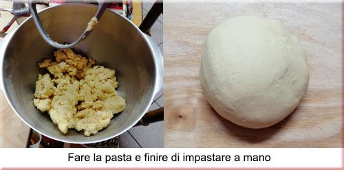 3.Mettere tutti gli ingredienti per la pasta nel contenitore della planetaria con gancio a foglia all’inizio, poi cambiare quando comincerà a formarsi l’impasto e finire con il gancio ad uncino. Utilizzare sempre una velocità moderata per non sforzare la macchina. Quando l’impasto sarà abbastanza addensato , proseguire ad impastare a mano fino a formare una palla omogenea. Se dovesse risultare secca lasciare riposare 5 minuti sotto una terrina e poi proseguire ad impastare ancora.