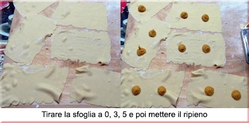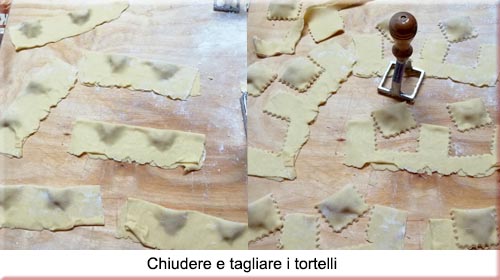 6.Con la sac à poche disporre i mucchietti di ripieno al centro della sfoglia , che devono essere poco più grandi di una nocciola e distanziati tra loro di circa due centimetri. Richiudere la sfoglia , pressare con delicatezza ai lati e intorno al ripieno per far uscire l’aria e poi procedere a tagliare con lo stampo i tortelli, premendo bene mentre si taglia la pasta.