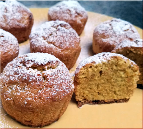4.Infornare le tortine disponendole su una placca da forno a uguale distanza tra loro per circa 30 minuti. Lasciare raffreddare prima di togliere dai pirottini e spolverare di zucchero a velo.